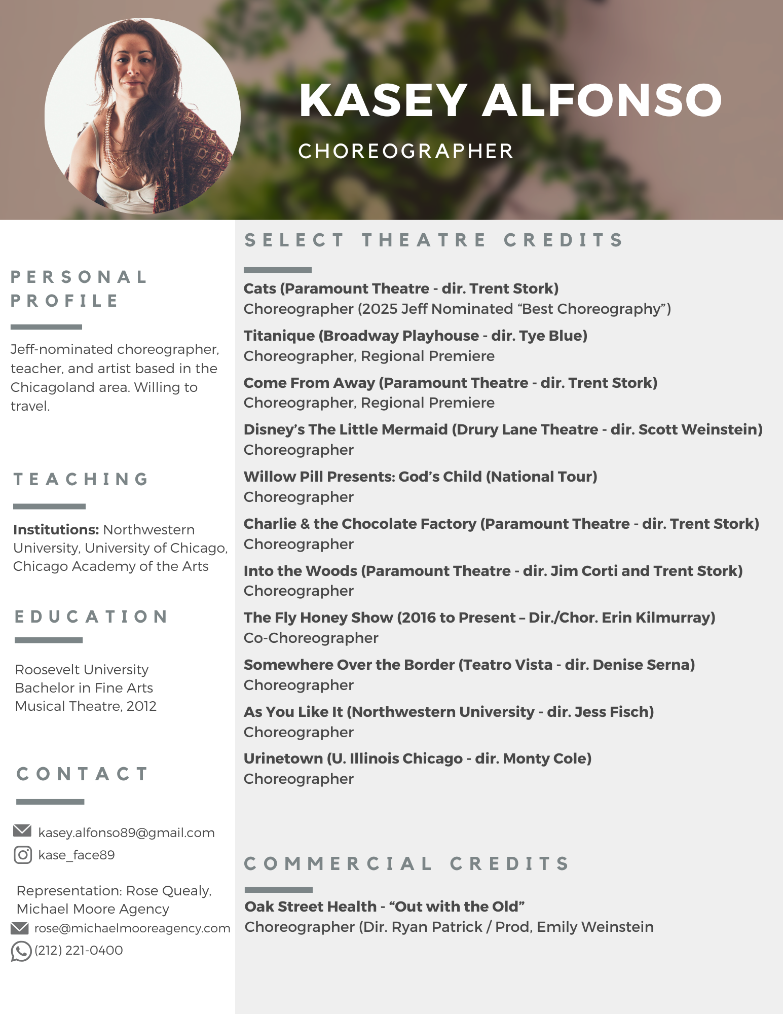 Kasey Alfonso (she/they) is a 2025 Jeff-Nominated choreographer, performer, and educator based in Chicago. Their choreography has been featured at the 1800-seat Paramount Theatre (CATS, COME FROM AWAY, CHARLIE AND THE CHOCOLATE FACTORY, INTO THE WOODS), the Broadway Playhouse (TITANIQUE - Chicago Cast), Drury Lane Theatre (DISNEY’S THE LITTLE MERMAID), Teatro Vista (SOMEWHERE OVER THE BORDER), and in collaborations with Northwestern University, University of Illinois Chicago, University of Chicago, and THE GRELLEY DUVAL SHOW, to name a few. She also choreographed the National Tour of GOD’S CHILD for RuPaul’s Drag Race Winner Willow Pill and is a long time cast member and choreographer for Chicago Institution THE FLY HONEYS, named “Best Dance Troupe” by the Chicago Reader five years in a row. Critics describe Kasey’s work as athletic, sparkling, energetic, emotionally driven, and stylish. As a Filipina woman, Kasey grew up dancing with her older cousins, who played Janet Jackson, Missy Elliot, Madonna, Salt-n-Pepa, and Ginuwine on repeat at her Tita’s house. Her choreographic style was born from that deep rooted love of the music video culture of the 90’s and early 2000’s, athletic training, and influences from queer dance styles.